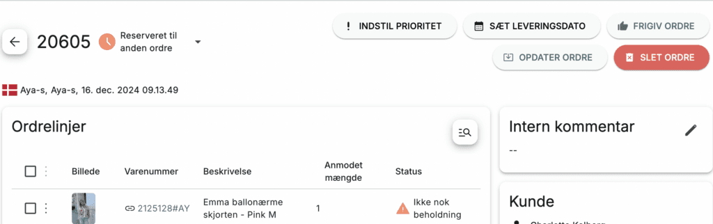 Her kan du se de ordrer du har - og deres status. Om de er sendt eller ej, og hvis de ikke er sendt kan du se hvorfor. En af dem du ofte vil møde er "Reserveret til anden ordre". Hvis du derefter tjekker status under "Ordrelinjer", kan du se en nærmere forklaring på årsagen, og i dette tilfælde se at der "Ikke er nok beholdning" (altså ikke nok på lager), til at varen kan sendes.