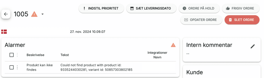 Det er også her du kan se hvis dine ordrer er gået i "fejl", det betyder at du har gjort noget i Shopify som gør at ordren ikke kan sendes. Vi har lavet en guide her på hvordan du kan behandle dine alarmer