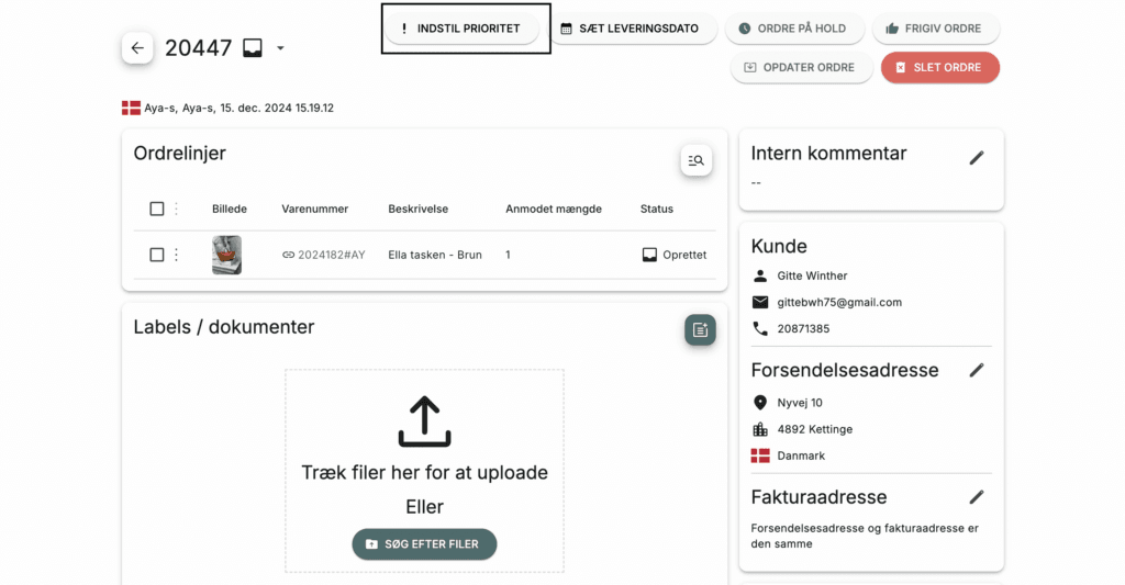 Nogle gange kan du få en ordre som haster mere end andre at blive sendt ud. I så tilfælde kan du bruge funktionen "indstil prioritet" i Peak. Så får vi automatisk besked om at du ønsker at vi prioriterer den ordre højere end andre. Du indstiller prioritet således: