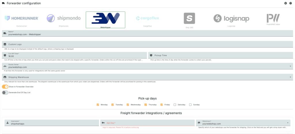 Vælg Webshipper som mulighed og udfyld nedestående felter: