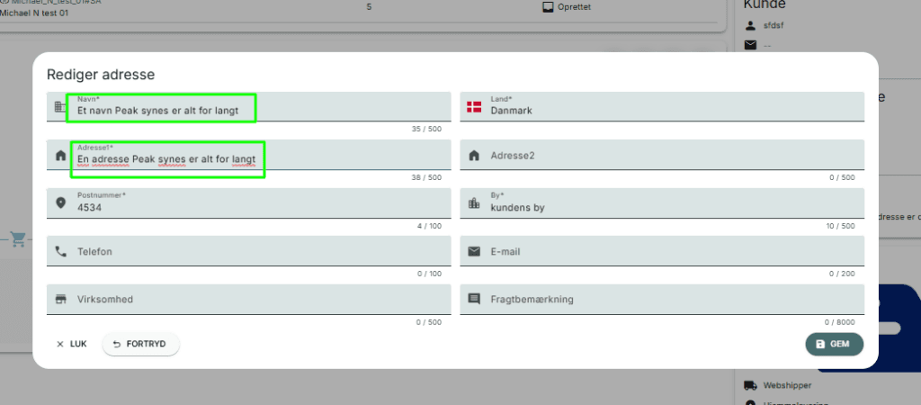 Order challengesToo long recipient address or recipient nameCopy MarkdownOpen inPeak requires that the customer's address and name are not too long. This is corrected by changing the name and/or address on the order in Peak. There is a + (plus) in the customer emailPrevious PageAdd phone number on your PeakWMS integration for return labelsNext Page