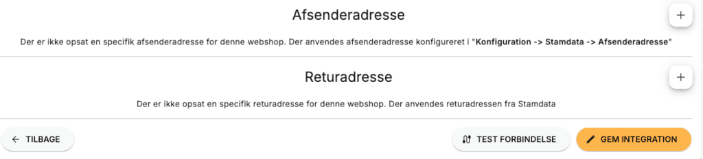 Then select the webshop you want to set the address for. At the bottom you see the two addresses you can enter. Press the "Plus" icon next to each so you can create them: