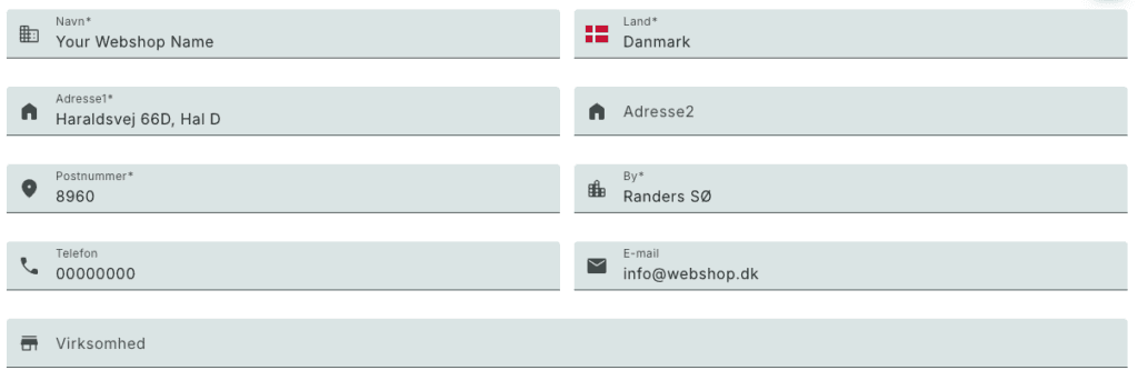 You must fill in our address, but your Webshop name, phone number and email. If you don't have a phone number you can write "00000000"